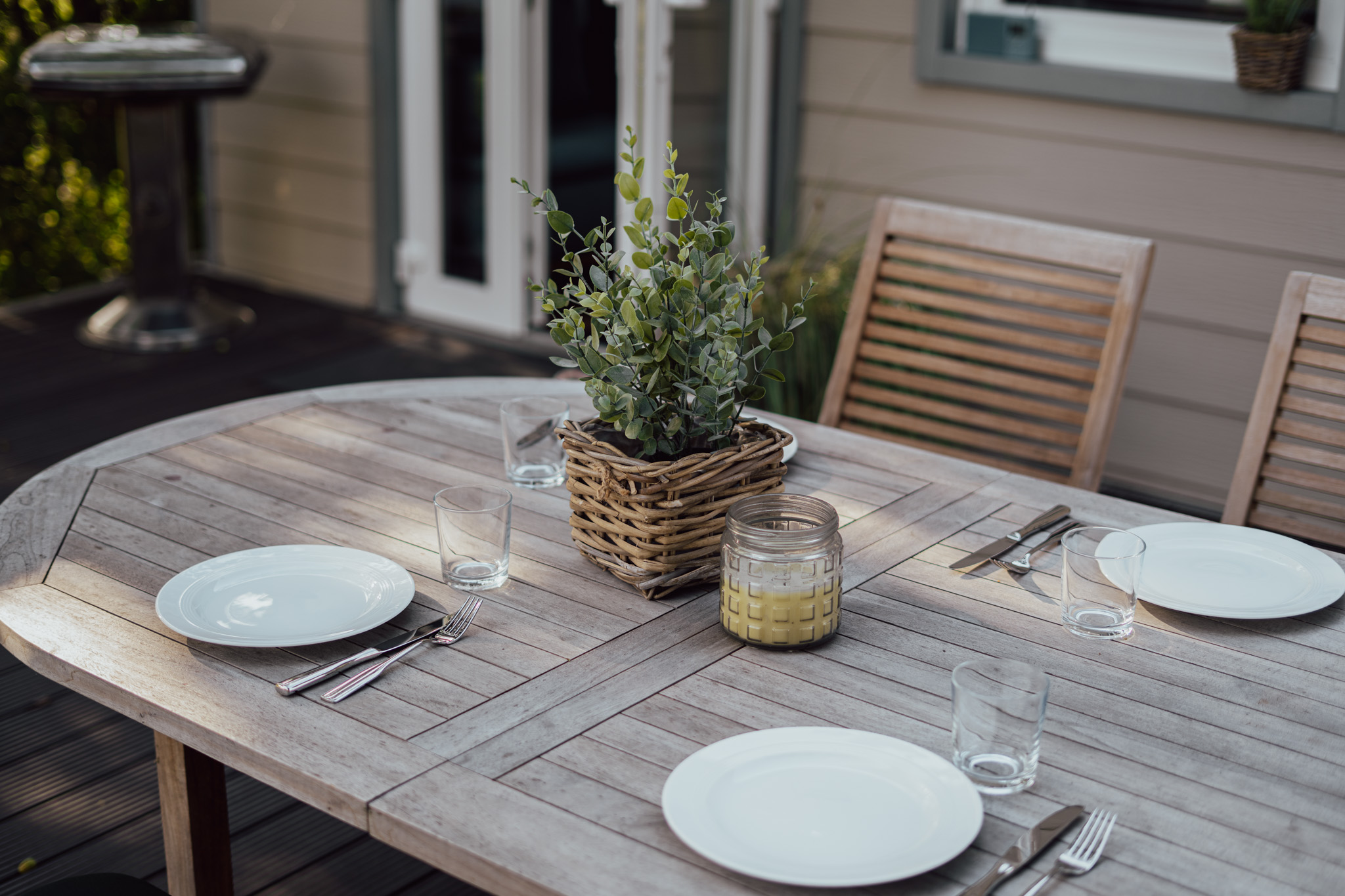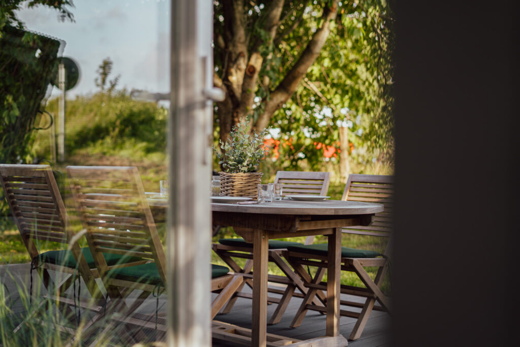 Draußen erwartet Sie eine eigene Terrasse – mit Grill – für lange Sommerabende, warme Sonnenstunden oder Kaffee in absoluter Ruhe.