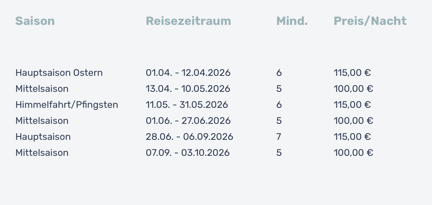 Preise gelten für 2 Personen, jede weitere Person wird mit 15,00 € / Nacht berechnet.